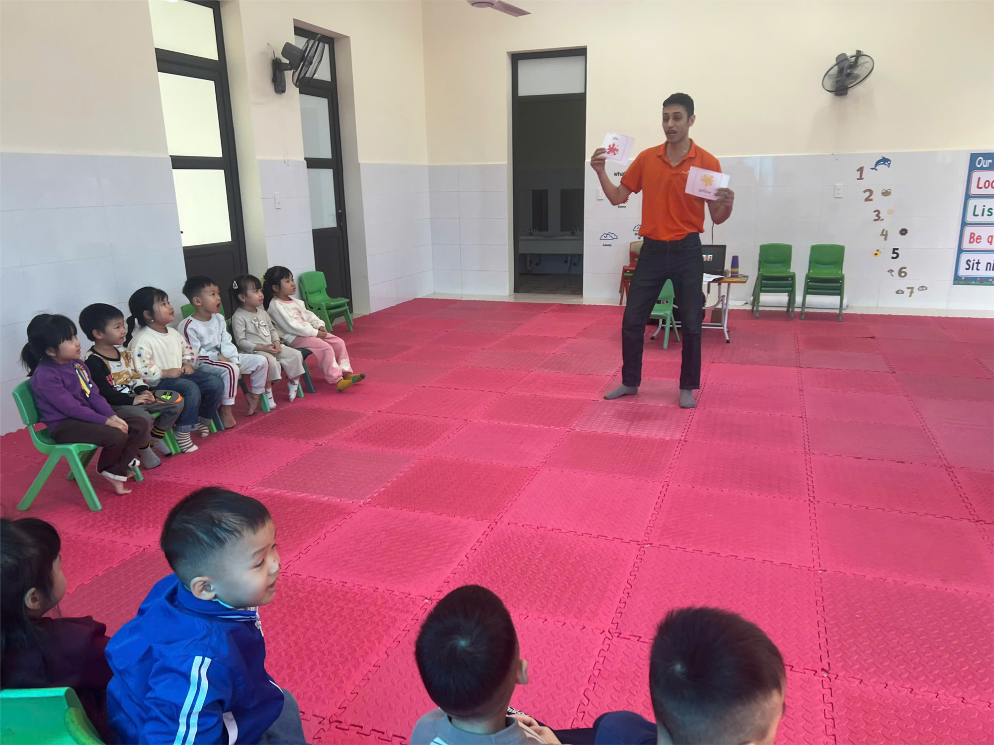 🧣Các con được nghe giáo viên nước ngoài phát âm mẫu, sau đó lặp lại qua các trò chơi như “Show me red!”, “Find something yellow!”, hay “What color is this?”. Việc học qua hoạt động trực quan giúp trẻ: