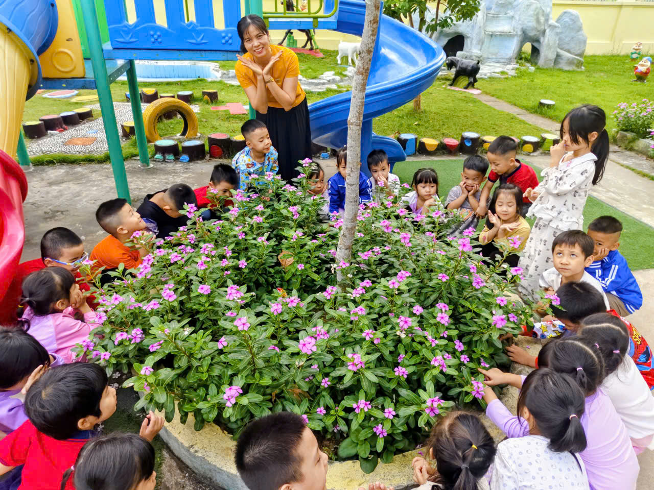 Mỗi ngày, các bé được quan sát thiên nhiên, chơi vận động, khám phá môi trường xung quanh và rèn luyện kỹ năng giao tiếp qua các trò chơi tập thể.