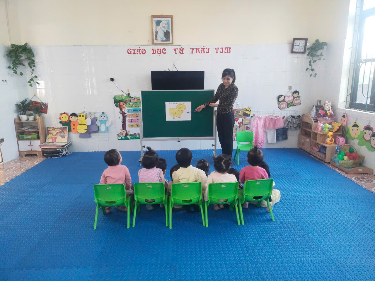 Trong giờ học, các bé được làm quen với hình ảnh con gà con đáng yêu, nhận biết đặc điểm đơn giản như: gà có mỏ, có cánh, có chân 🐥.