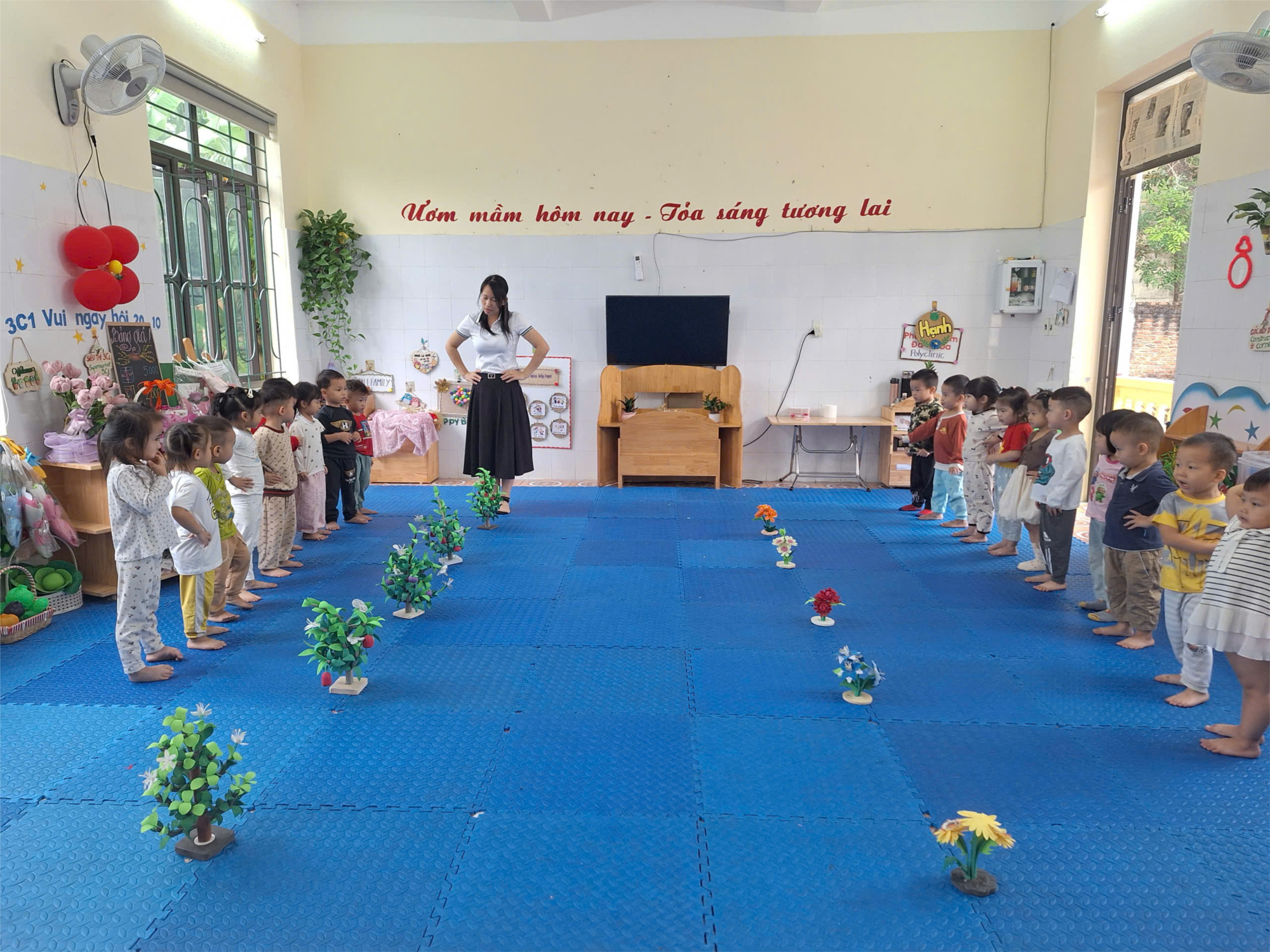 🚶♀️ Dưới sự hướng dẫn của cô, từng bé khéo léo bước theo đường zích zắc, giữ thăng bằng thật giỏi để không chạm vào cây hoa hay trái chín hai bên.
