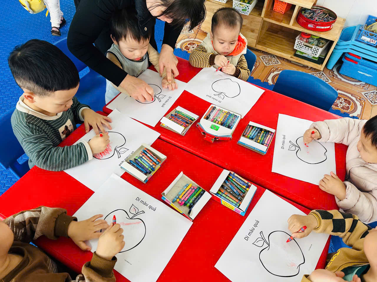 Những bàn tay bé xinh cầm bút di màu cho bức tranh quả của mình, những nét di màu của các con còn khá nguyệch ngoặc nhưng đáng yêu làm sao. 🌻